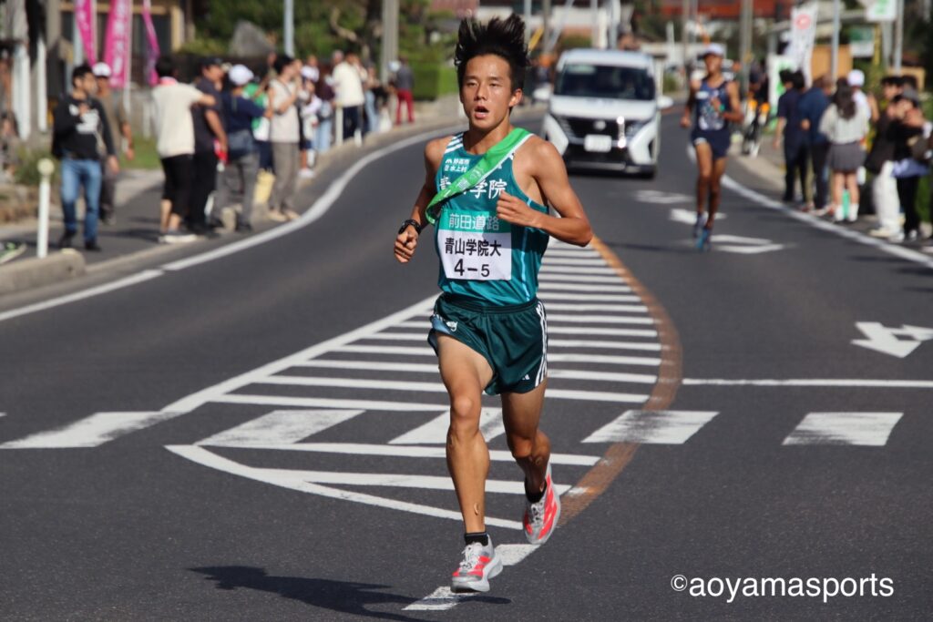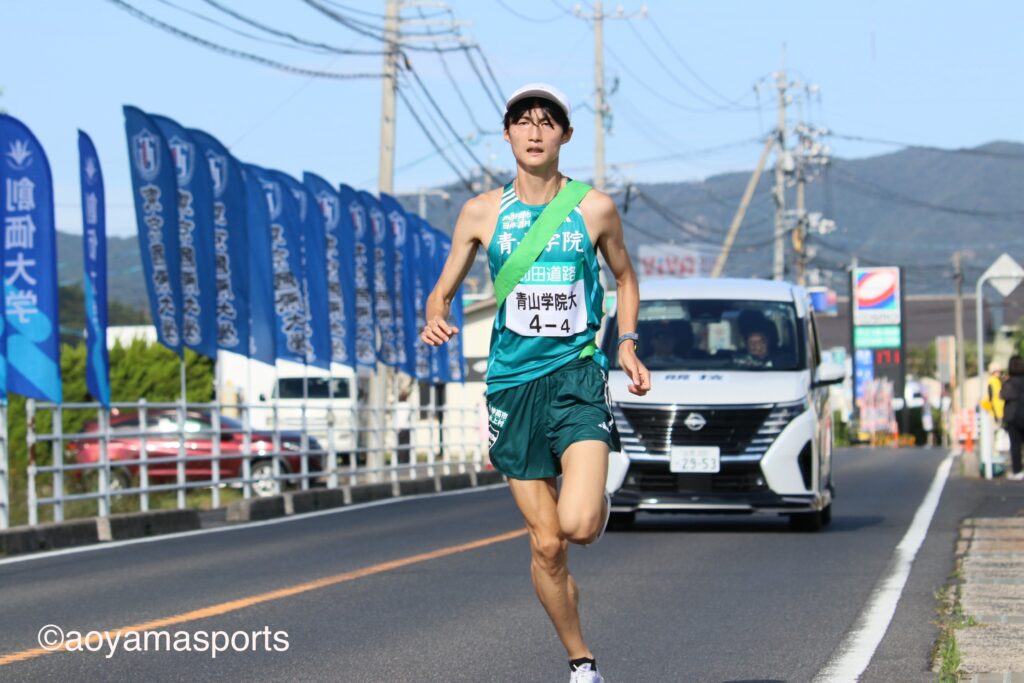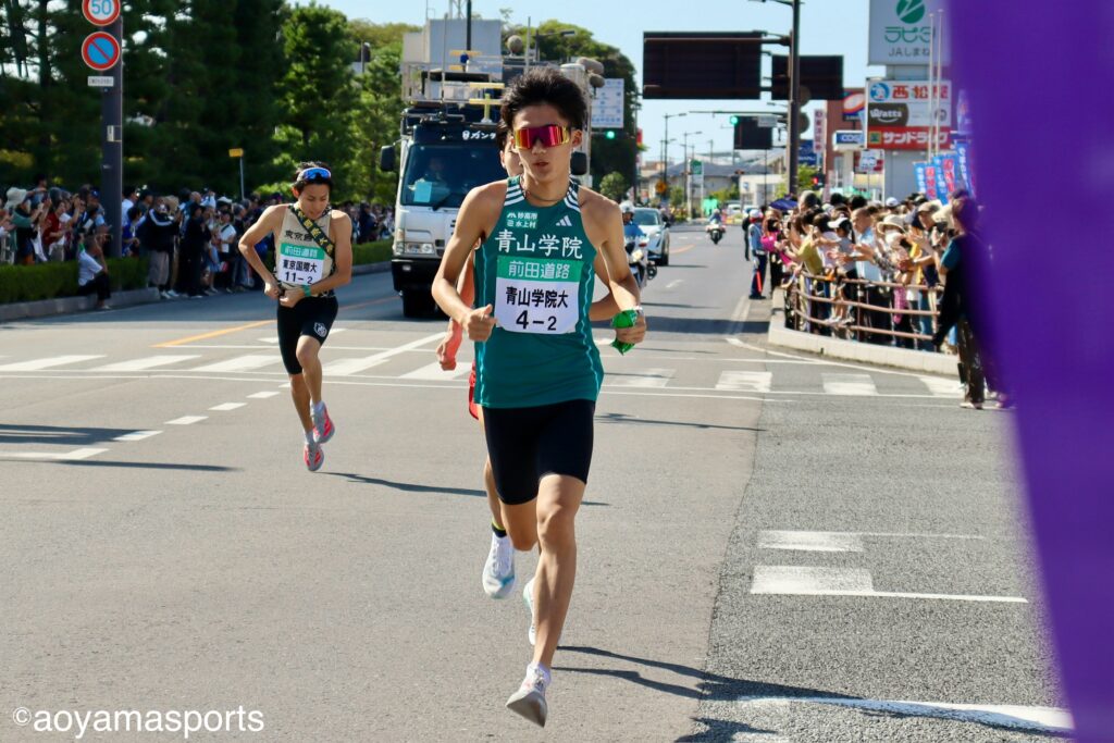 4区を務めたのは青学大で唯一の1年生ランナーである神邑。先日行われた絆記録会では5000mの自己ベストを大きく更新する走りを見せ、今大会では4区に大抜擢された。11位で襷を渡された神邑は果敢な走りを見せ、追い上げを図る。懸命な追い上げで10位との差を12秒詰め、トップとの差は2分22秒で襷を繋いだ。
