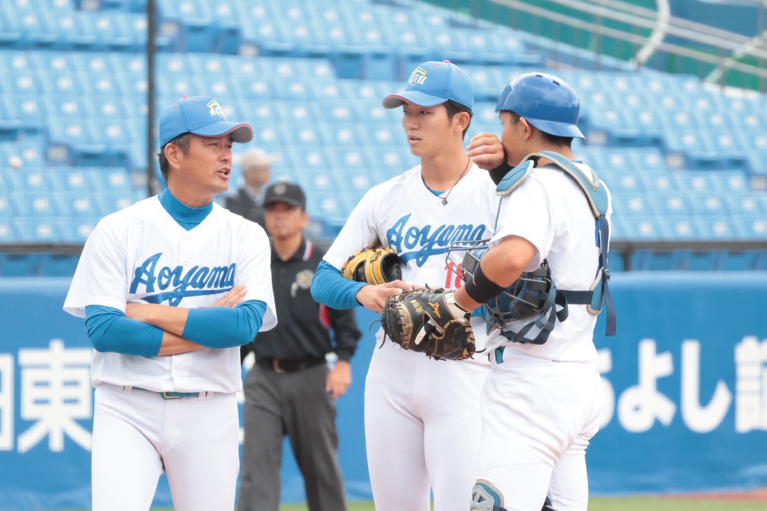 7回、青学大は高木に代えて、大学公式戦初登板となる田端をマウンドに送り出す。田端は140㌔を超えるストレートを投げ込み、最初のイニングを無失点で抑える。しかし8回、田端は安打と四球で二死一、二塁となると、三塁線を破る適時二塁打を打たれ1点を失った。