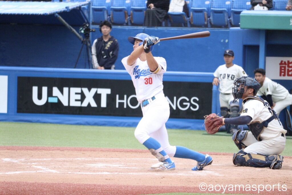 最終回、青学大は一死から打撃好調の主将・藤原夏暉(法4=大阪桐蔭)が意地のヒットを見せる。しかし後続が倒れゲームセット。開幕からの連勝は6で止まった。