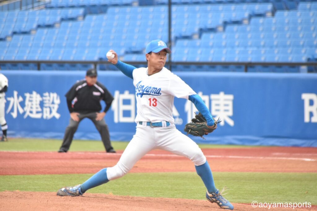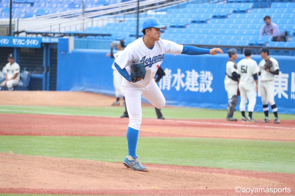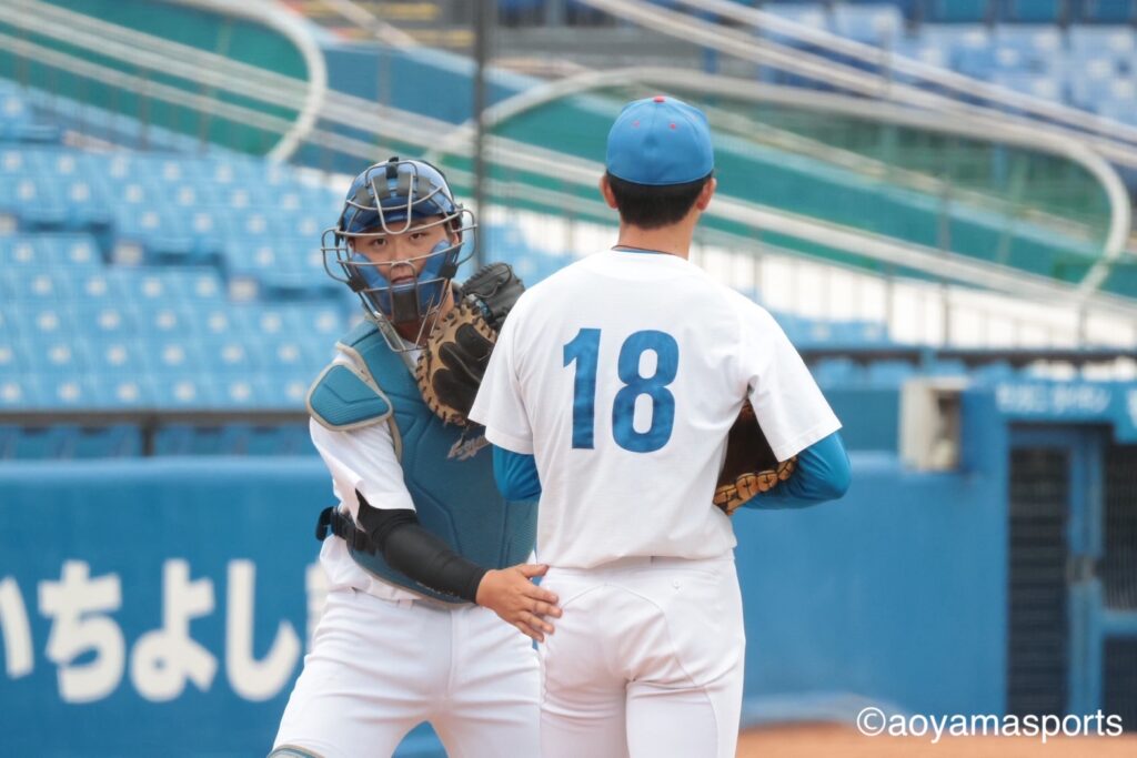 一方の打線は3回、二死から大神浩郎(総1=福岡大大濠)が安打を放つと、盗塁を決め二死二塁のチャンスを作る。続く藤原夏暉(法4=大阪桐蔭)が左前へ安打を放ち先制点かと思われた場面だったが、大神が雨で濡れたグラウンドに足を滑らせ転倒し三塁でストップ。青学大はその後のチャンスも生かせず結局無得点となった。