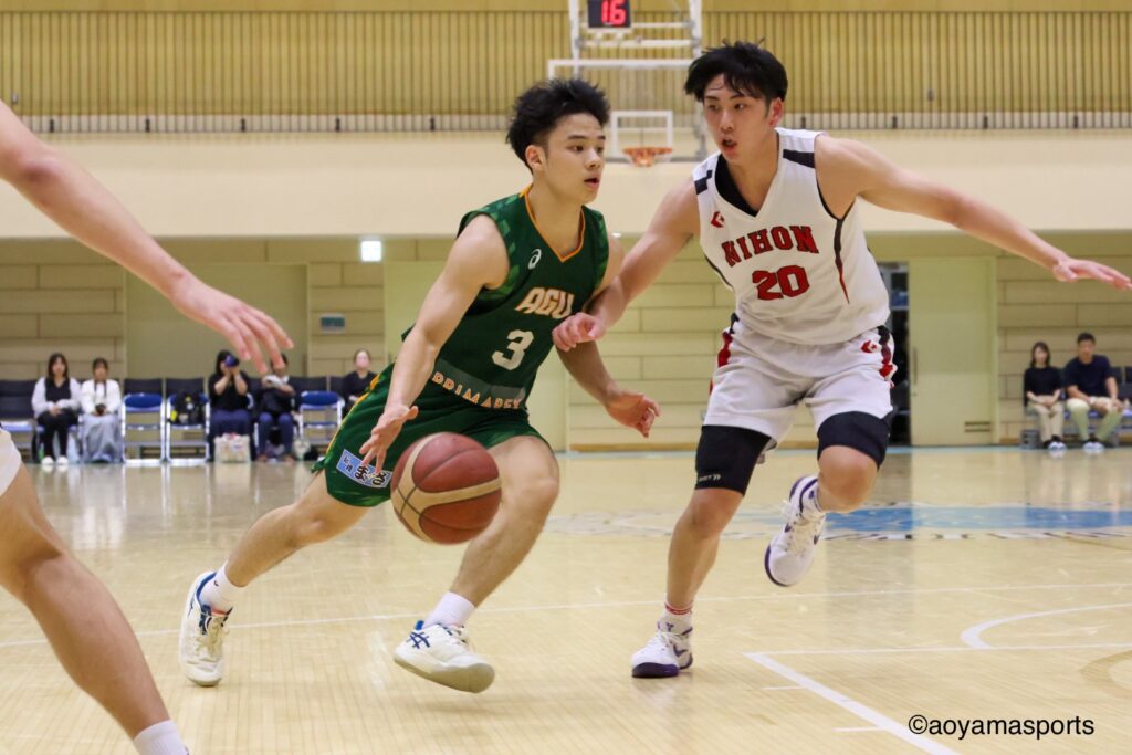 第1Qは青学大ボールからスタート。#35オドゲレル(数4)のアシストパスを受けた#12広瀬(総3)のシュートで青学大が先制。その後も#3新井(総4)や#23加藤(コ4)のシュートで得点を重ねるが日大も高確率で3ポイントシュートを決め両者譲らぬ展開へ。前半は青学大ペースで試合を進めるが第1Q中盤に日大がペースを掴み始めリードを奪われる。それでも第1Q残り1分のタイムアウト明け、#15能代(コ3)がポストプレーで得点に繋げ15-21の6点ビハインドで第2Qへ。