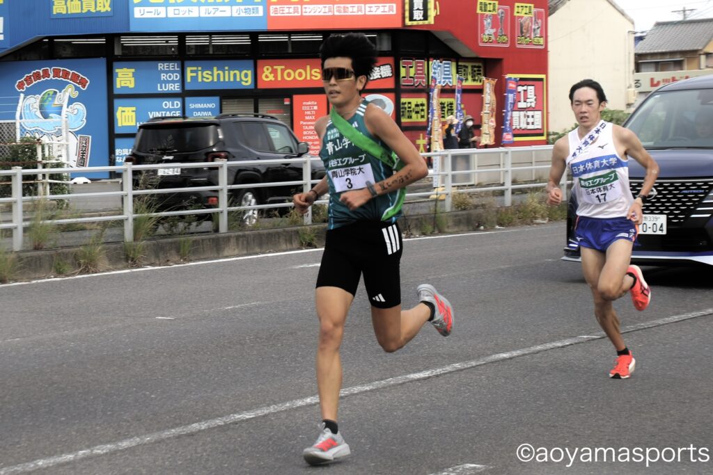 1年生ながらもトラックシーズンからフレッシュグリーンを背負ってきたルーキーが、学生三大駅伝初出走を果たした。スタートから集団の前方に躍り出ると、一時は先頭にたちレースの主導権を握った。勝負が動いたのは残り2.5km付近。国道23号に入り徐々にペースアップをしてきた集団が、下りを使って一気に加速し集団は縦長に。榅山は揺さぶりにも二番手で必死に食らいつく。しかし、新庄新川橋にて各校の駅伝巧者たちが更にスパートをかけるとついていけず、区間12位となった。今大会では駅伝の厳しさに直面することとなった。それでも、1年生から三大駅伝にて各校のエース級と戦い、そのレース運びを間近で見た経験はこれからの糧となるはずだ。