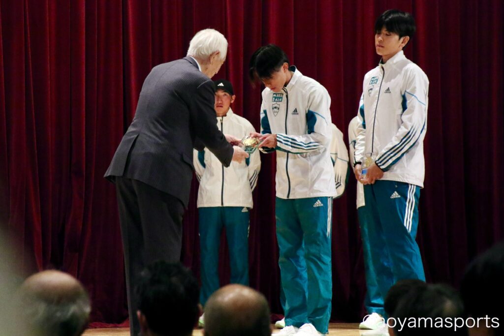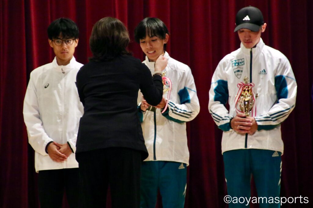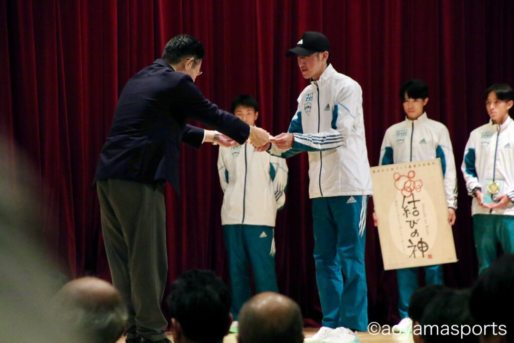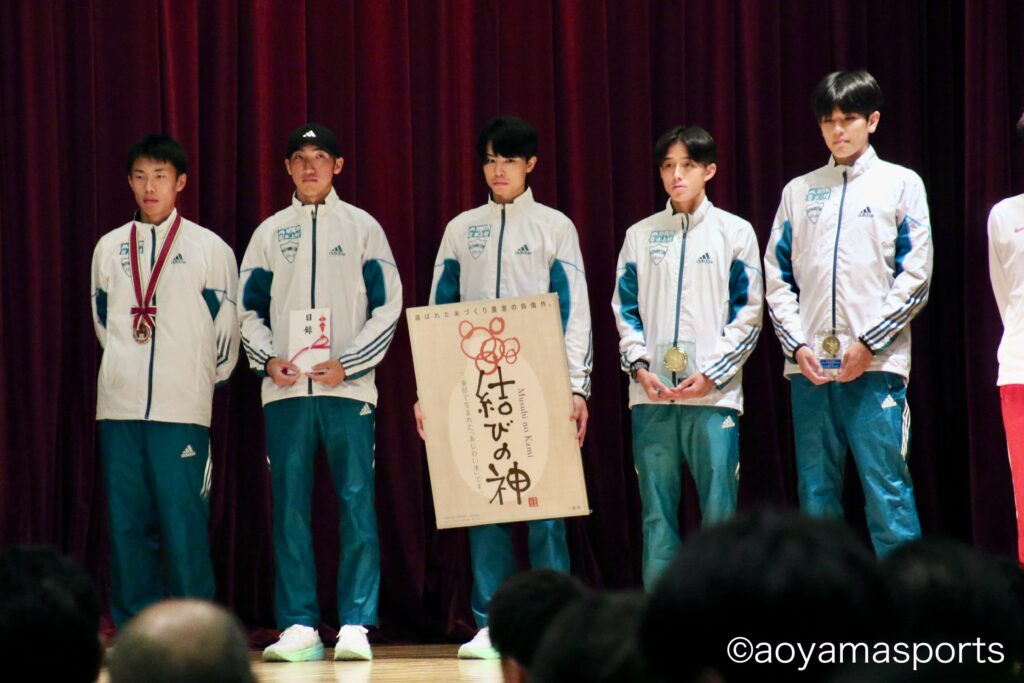 3位で今大会を終えた青学大。選手・関係者は14時30分から、三重・神宮会館大講堂で行われた閉会式に参加した。3位の表彰では、代表として荒巻・飯田・宇田川・塩出・佐藤の5人が登壇。区間賞の表彰では、6区区間賞の飯田・7区区間賞・区間新記録の黒田も登壇した。惜しくも目標の優勝には届かなかったが、各選手奮闘を見せた。その中で悔しさを抱えながらも、表彰の場では授与者の目を見て微笑む、青学らしい品性と温かさも見られた。