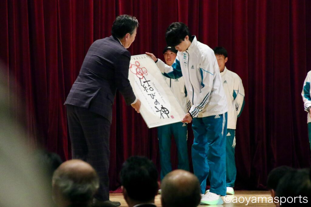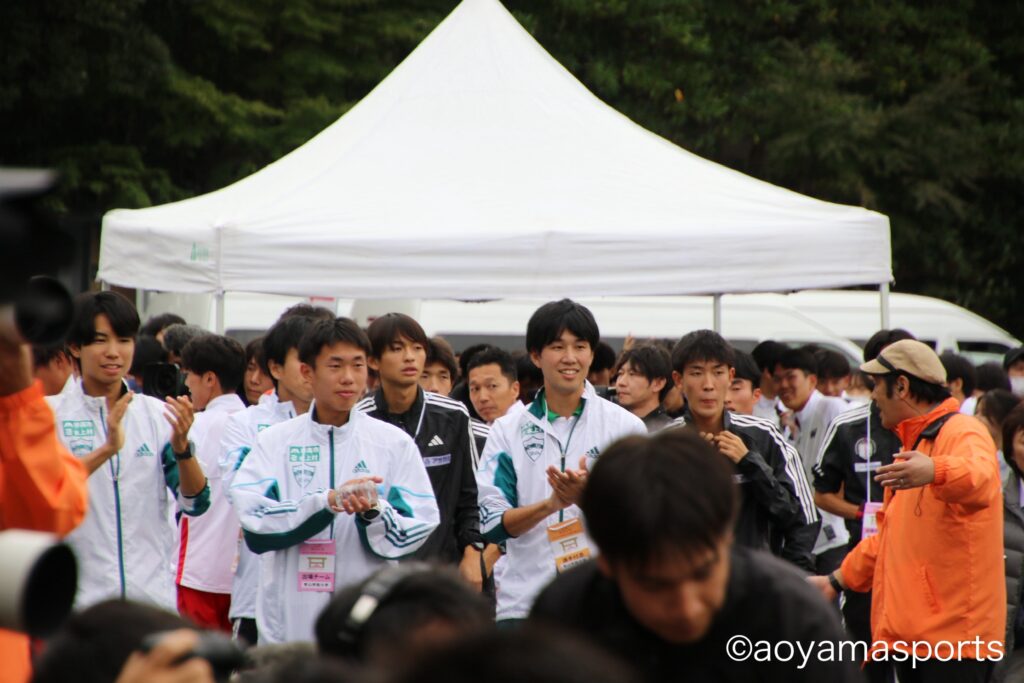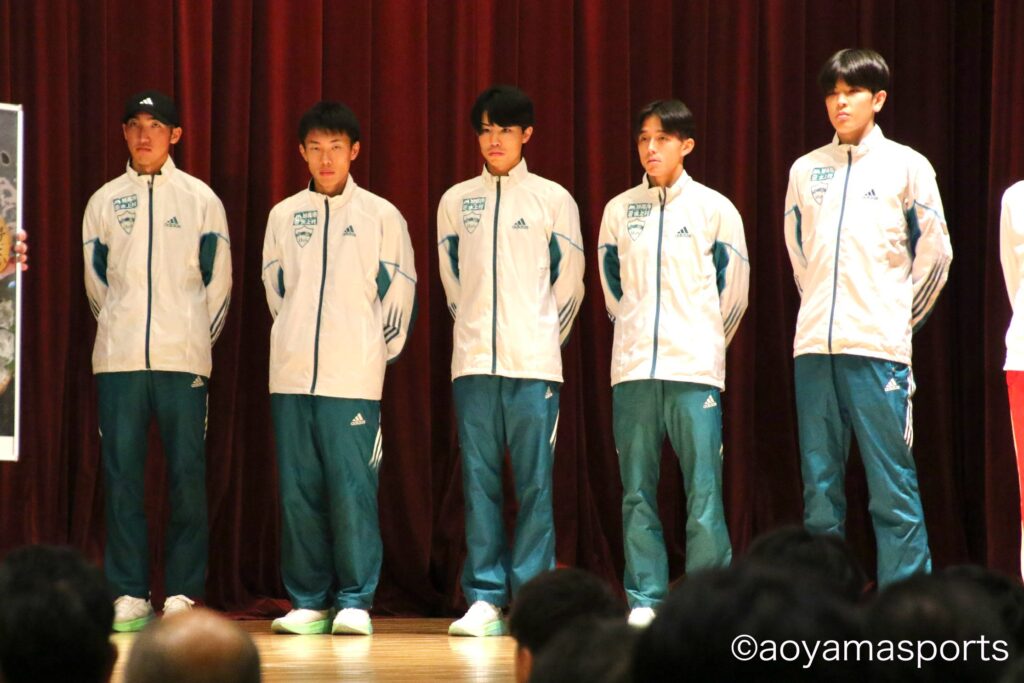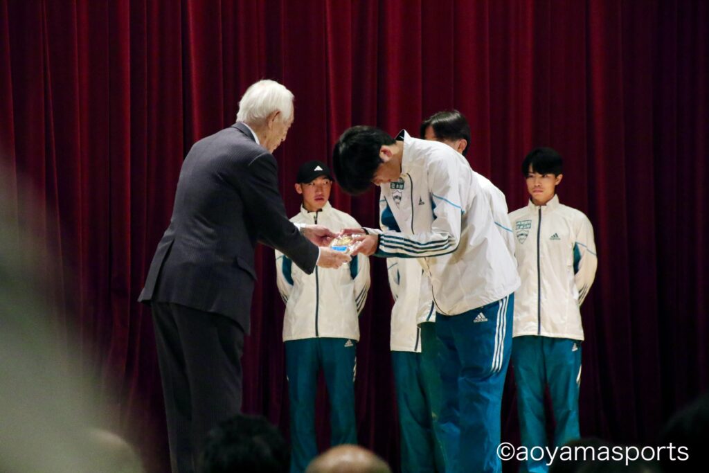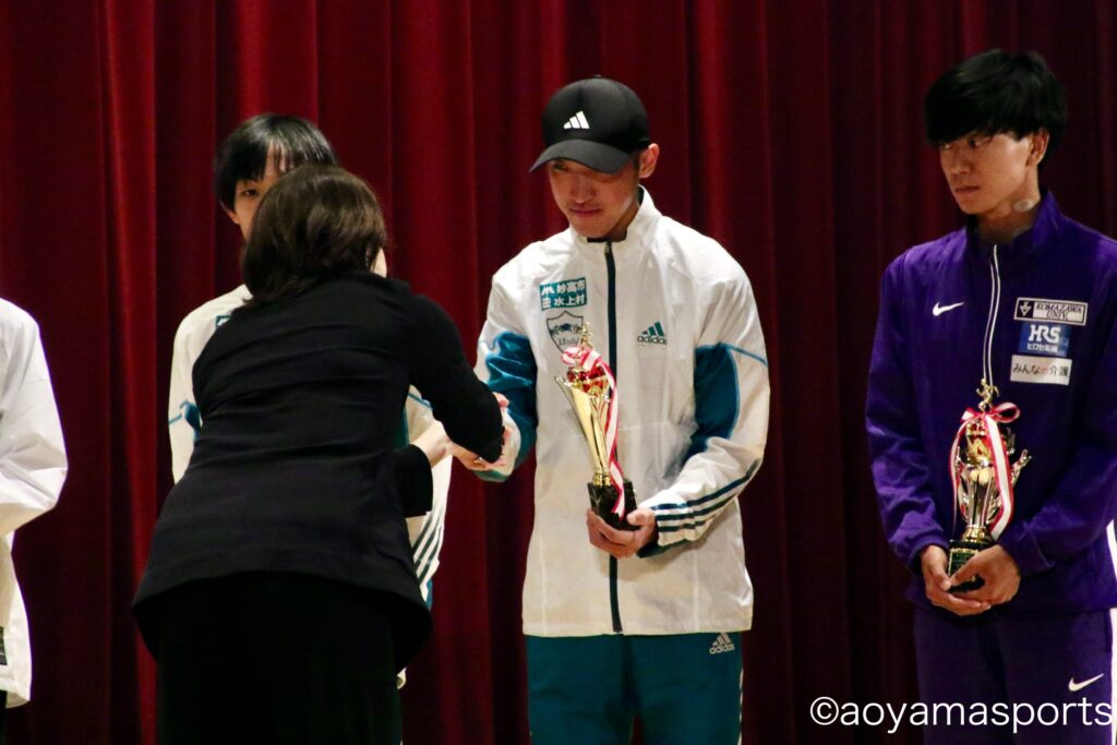 3位で今大会を終えた青学大。選手・関係者は14時30分から、三重・神宮会館大講堂で行われた閉会式に参加した。3位の表彰では、代表として荒巻・飯田・宇田川・塩出・佐藤の5人が登壇。区間賞の表彰では、6区区間賞の飯田・7区区間賞・区間新記録の黒田も登壇した。惜しくも目標の優勝には届かなかったが、各選手奮闘を見せた。その中で悔しさを抱えながらも、表彰の場では授与者の目を見て微笑む、青学らしい品性と温かさも見られた。