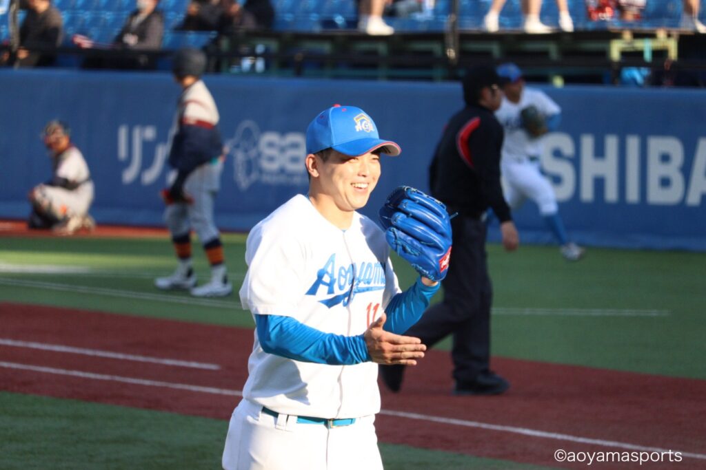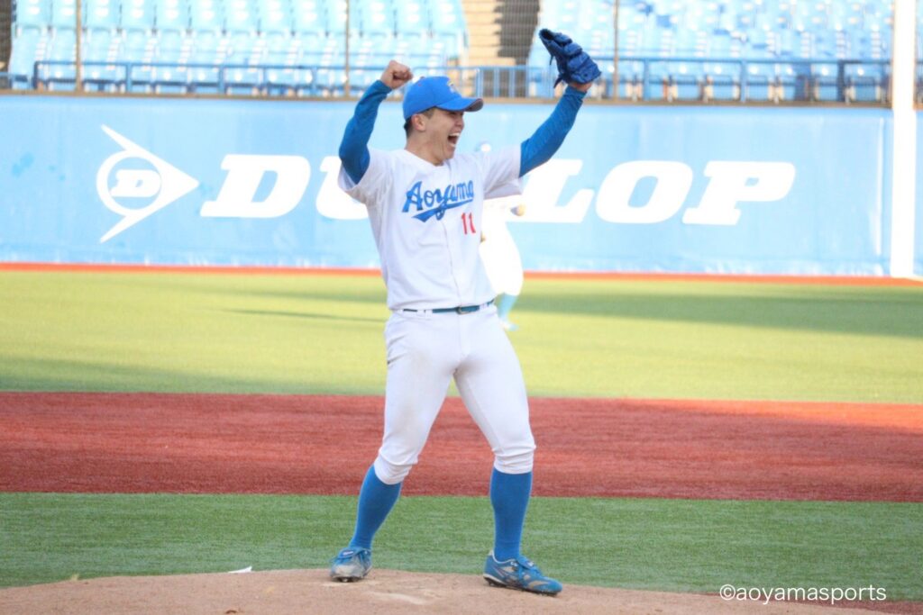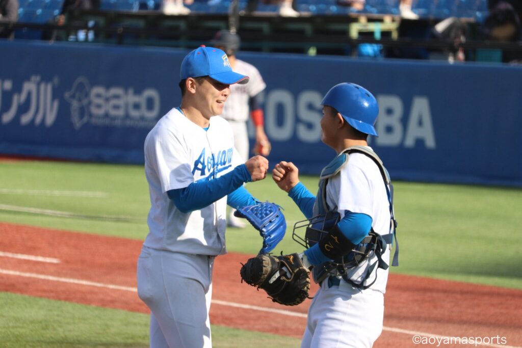 9回裏のマウンドに立ったのも中西。「負けたくない、勝ちたいという気持ちが何倍にも強くなった」と、青学大野球部としての強い使命を胸に投げる中西の球に誰も手を出すことができない。高校時代から約5年女房役を務めてきた渡部は中西の投球を振り返り、「本当に今まで1番と言っていいぐらいのピッチングだった」と語る。4年間の中西を振り返り、指揮官は「最初は本当に我が強いというか、ガキというか。最上級生になって変わったのは、本当のエースになるには、立ち居振る舞いも大事なんだって。最後の最後、本当の意味で変わってくれたかな」その言葉通り中西は最後も三者連続三振で打ち取ると、マウンドで大きなガッツポーズをみせた。渡部と抱き合い、選手らはマウンドに集まり、互いを称え合った。青学大は史上6校目の大会連覇を果たし、大学「三冠」を達成した。
