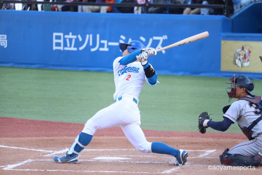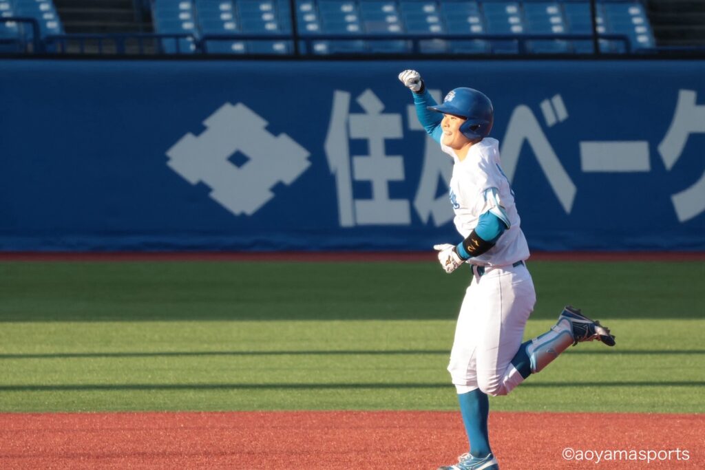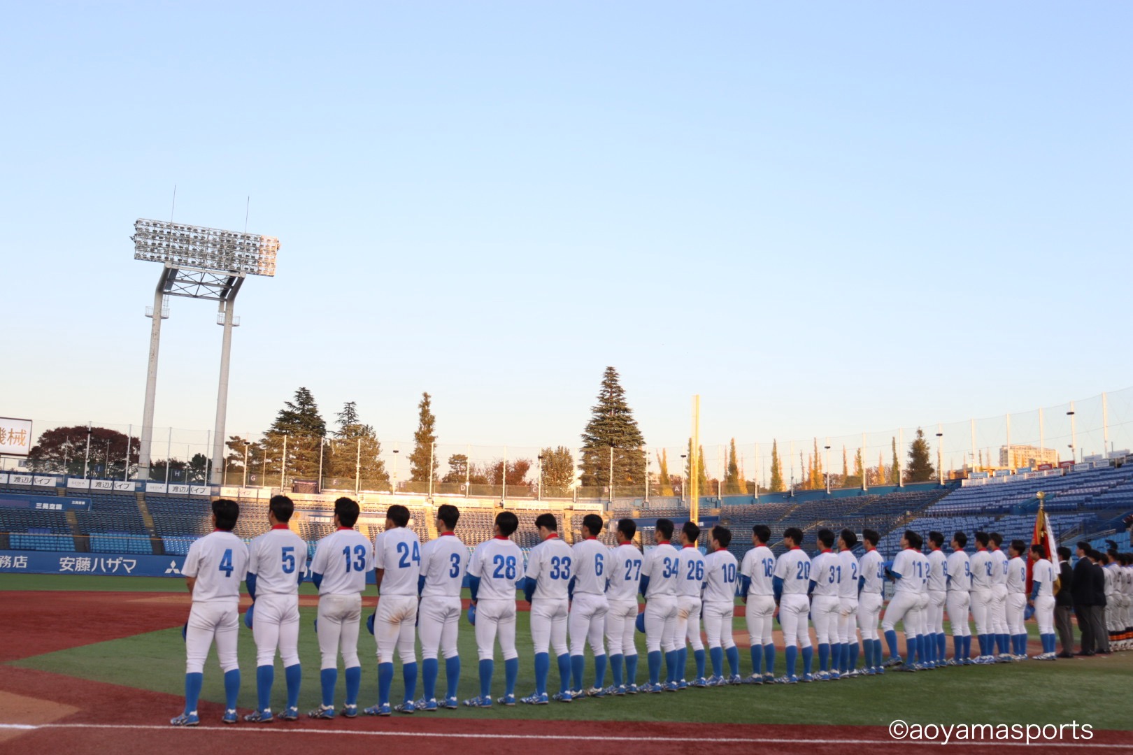 決勝のマウンドには中西聖輝(コ4=智辯和歌山)が上がった。3日前に完投勝利を挙げた勢いそのままに、7回二死まで安打を許さない快投。打線6回に主将・藤原夏(法4=大阪桐蔭)の安打を起点にチャンスを作ると、渡部海(コ3=智辯和歌山)が先制の左越3ラン本塁打を放つ。続く7回には谷口勇人(営3=大阪桐蔭)適時打でリードを4点に広げた。援護を受けた中西はその後も圧巻の投球で9回17奪三振無失点の完封勝利を挙げた。青学大は4-0で快勝し、明治神宮大会2連覇、そして日本一奪還を達成した。