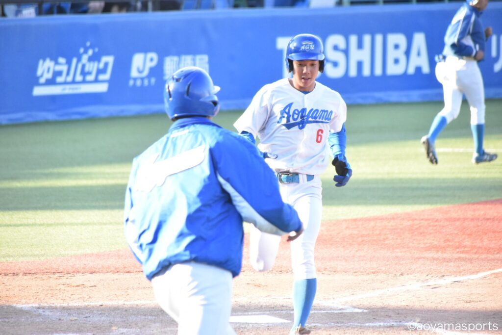 7回には山口翔梧(営2=龍谷大平安)が四球で出塁すると、谷口が立命大の好投手・有馬の高めのストレートをうまく捉えるタイムリーヒットを放った。山口は4点目のホームインを決めた。