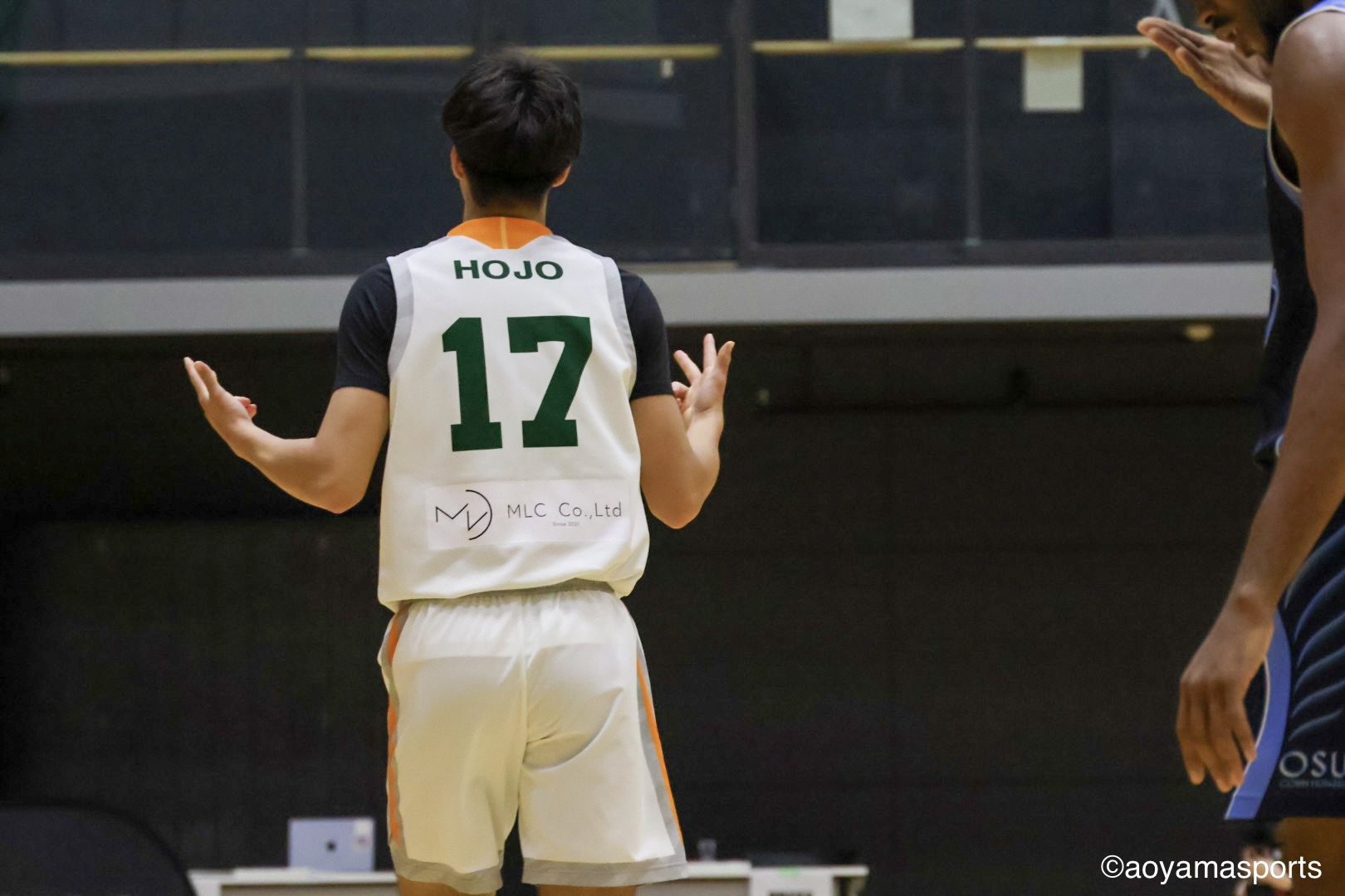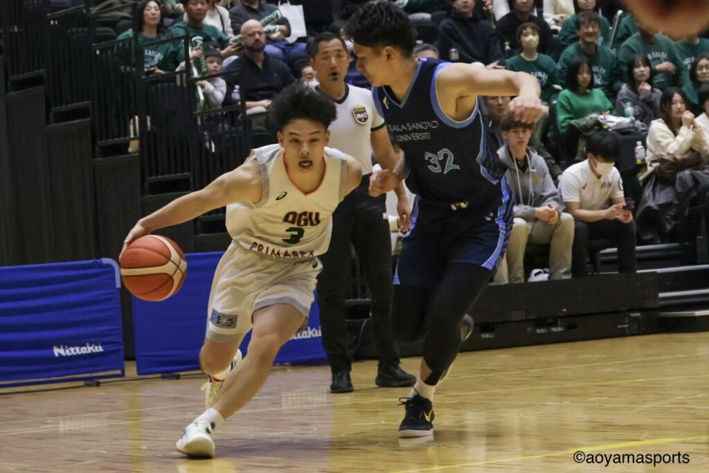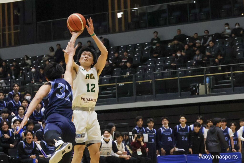 第4Qは大産大ボールからスタートするが大産大の得点を許さず#35オドゲレルがリバウンドを取り#77芦田(国経3)の3ポイントシュートで青学大が先制。その後、一時大産大が流れを掴み点差を縮めてくるが、第4Q後半、#77芦田や#17北條が3ポイントシュートを決め次戦に繋げるプレーで締め94-75で大産大に勝利した。