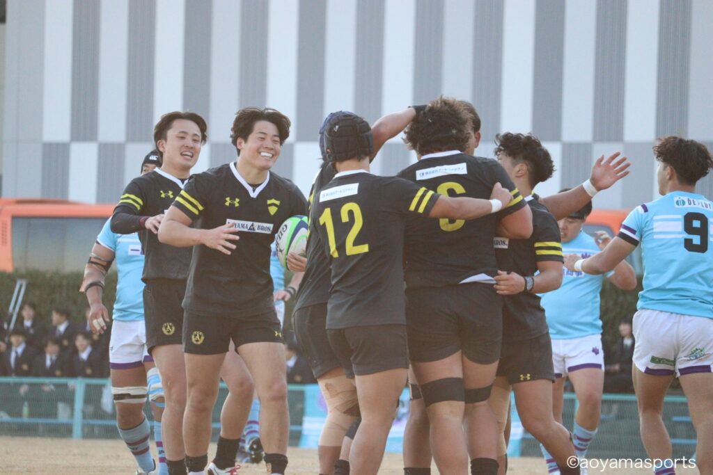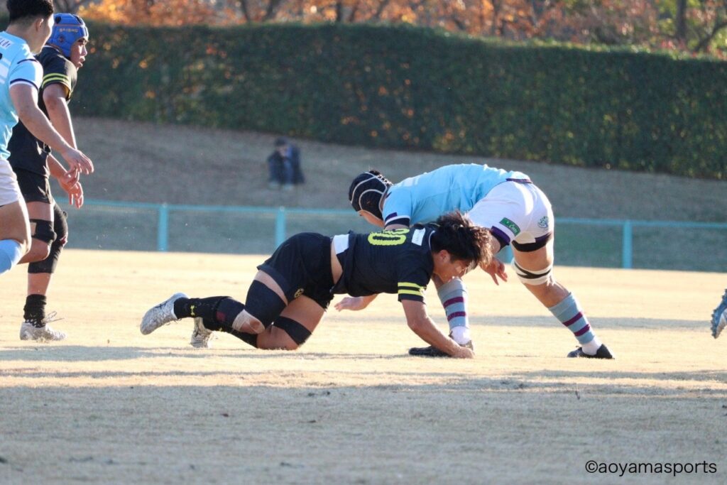 入替戦回避へ、なんとか踏ん張りたい青学大。後半開始直後、敵陣ラインアウトを獲得した青学大はフェーズを重ねて攻め込むとトリックプレーが成功し、山田壮がラインブレイク。サポートした松﨑がそのままフィニッシュし、15-33と点差を縮めた。