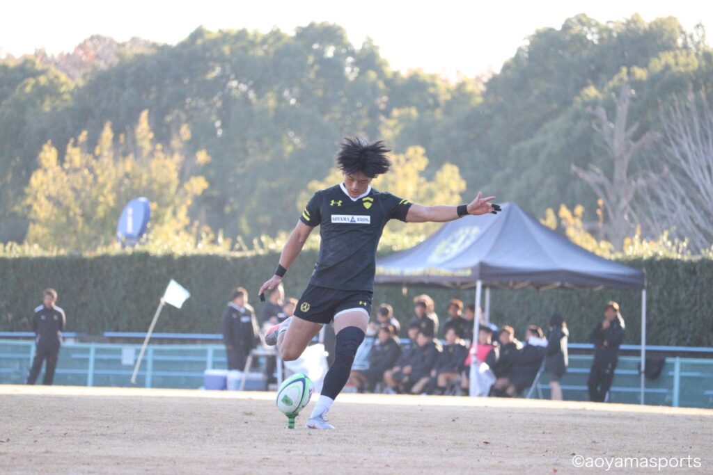 前半は青学大が気迫を前面に押し出す。開始早々、袖山遼平(法3=國學院久我山)が鋭いタックルで相手のミスを誘発。ここからペナルティを奪い、攻勢のムードを作り出した。筑波大のスクラムの乱れから敵陣で再びペナルティを獲得すると、青学大はペナルティゴールを選択。井上が冷静に決め、先制に成功した。