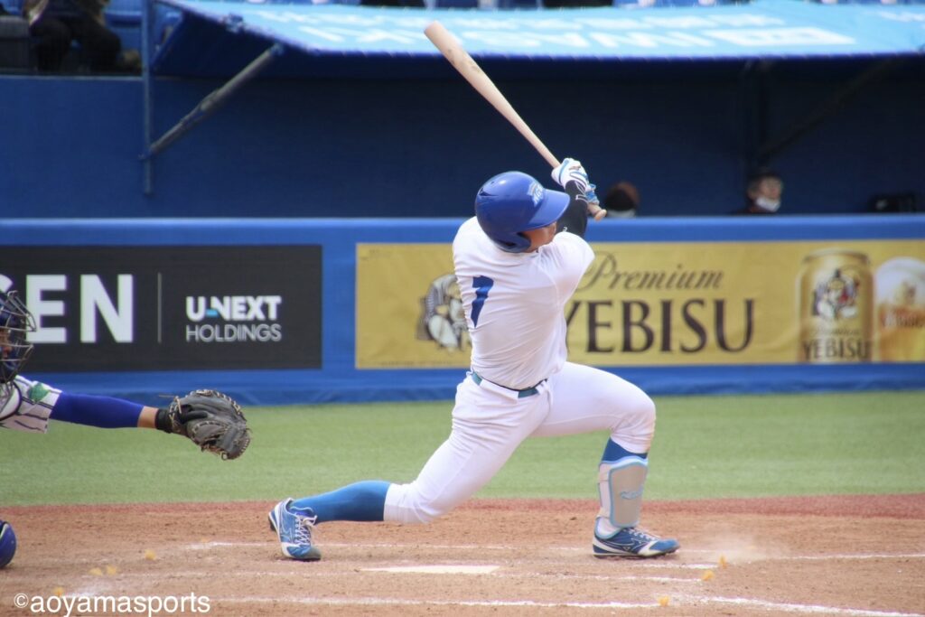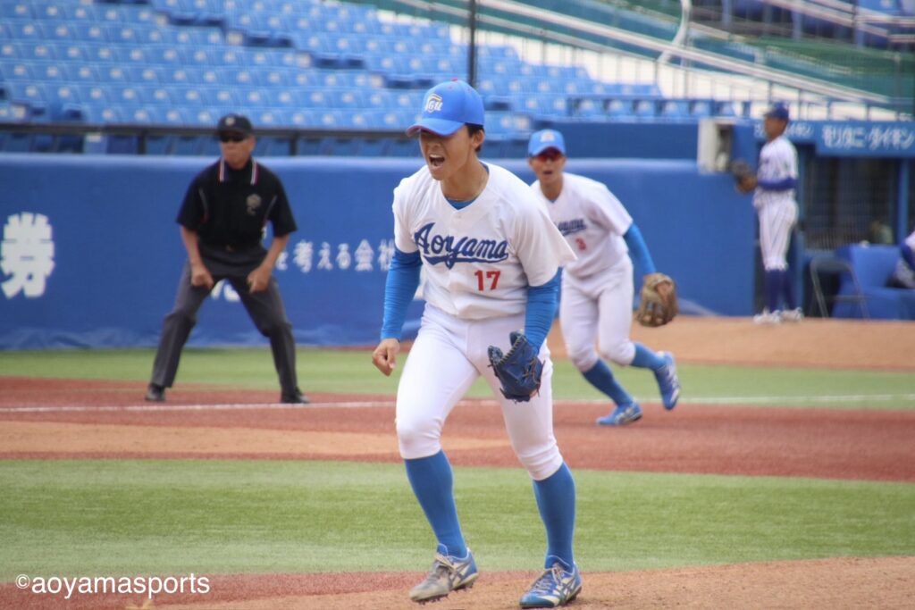 1点差に詰め寄った青学大は、7回には菅野陽平(総1=福岡大大濠)と山口翔梧(営3=龍谷大平安)の連続安打で得点圏に走者を置くと、大神の犠飛で同点に追いつき、試合を振り出しに戻す。