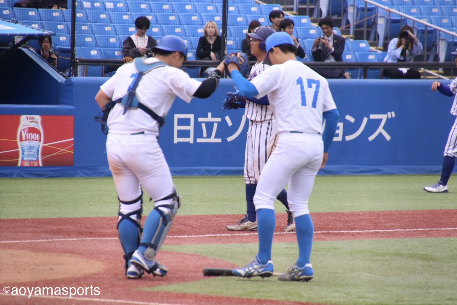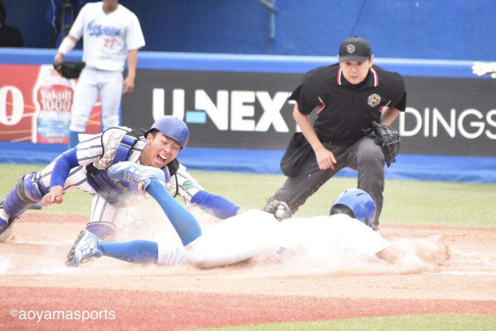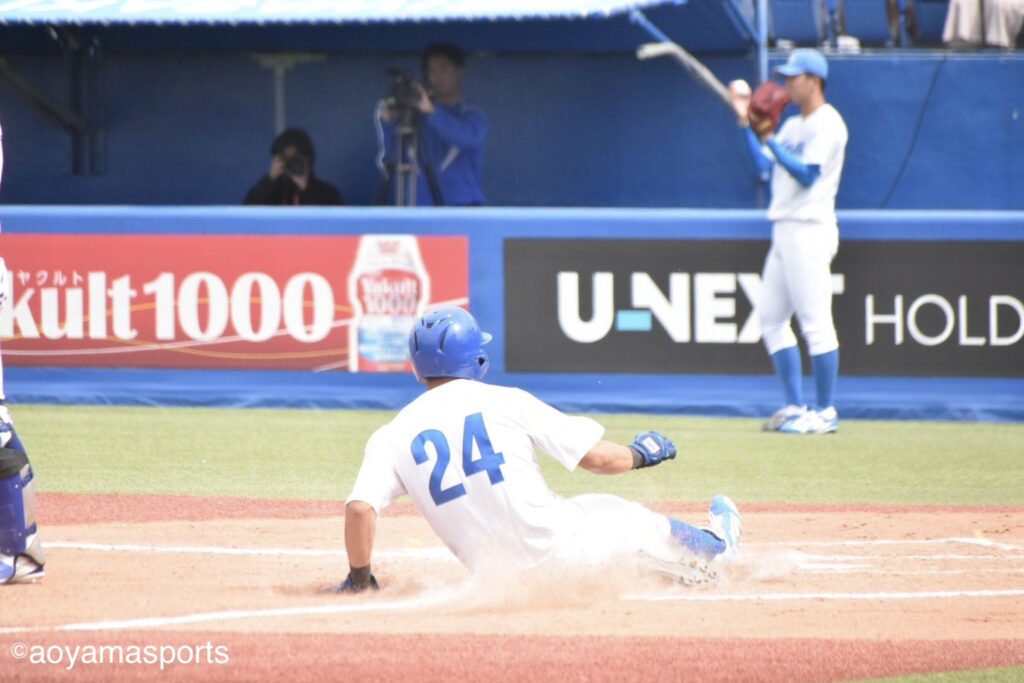 菅野の気迫のヘッドスライディングで、青学大は同点に追いついた