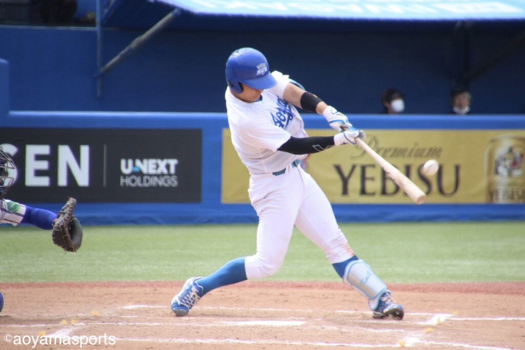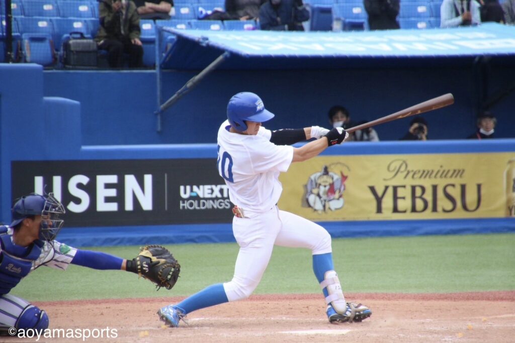 点差を広げられた青学大は直後6回、ついに反撃に出る。大神と松本が安打で出塁すると、続く渡部が犠飛を放ち1点を返す。