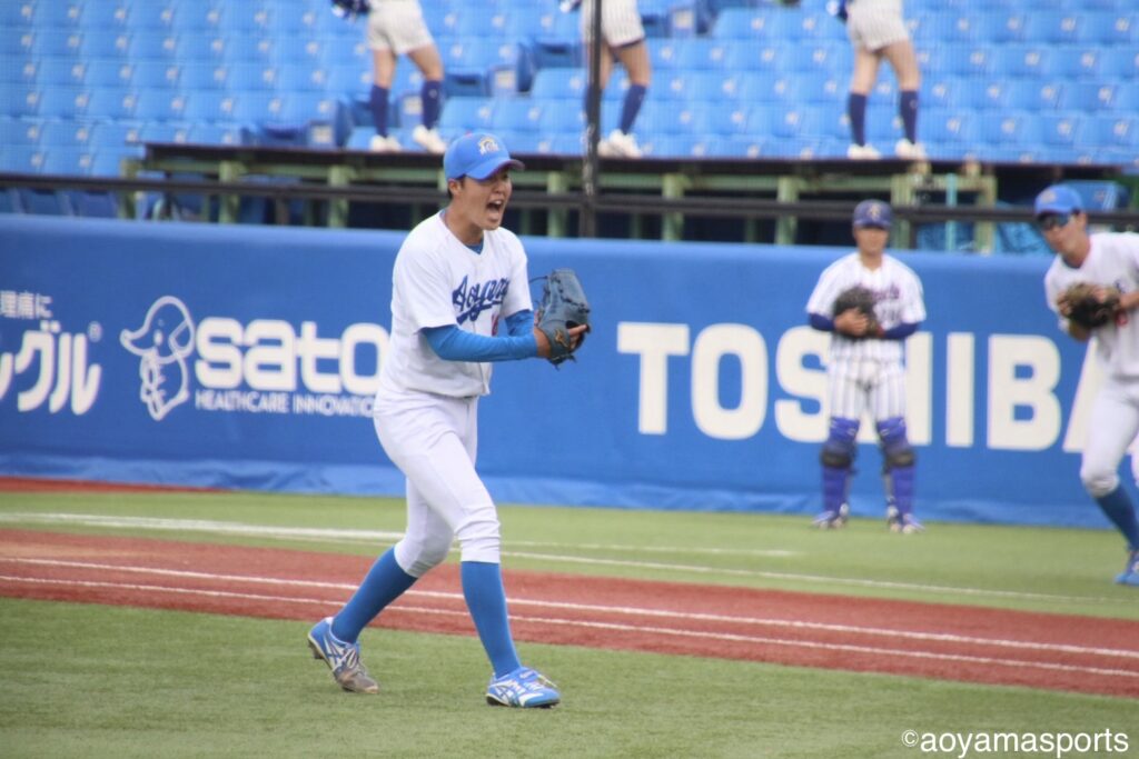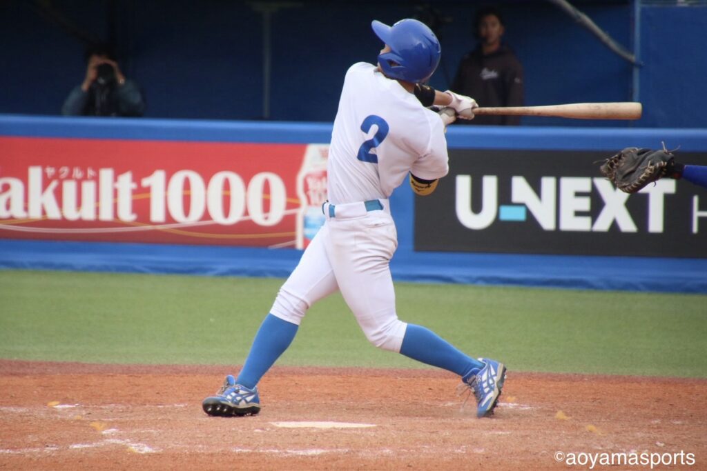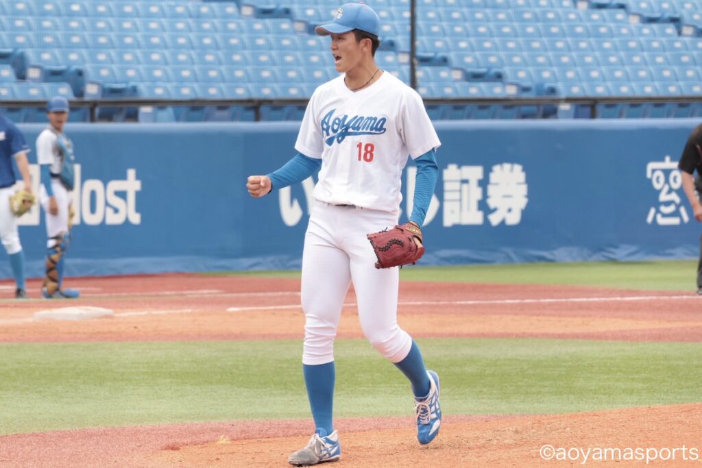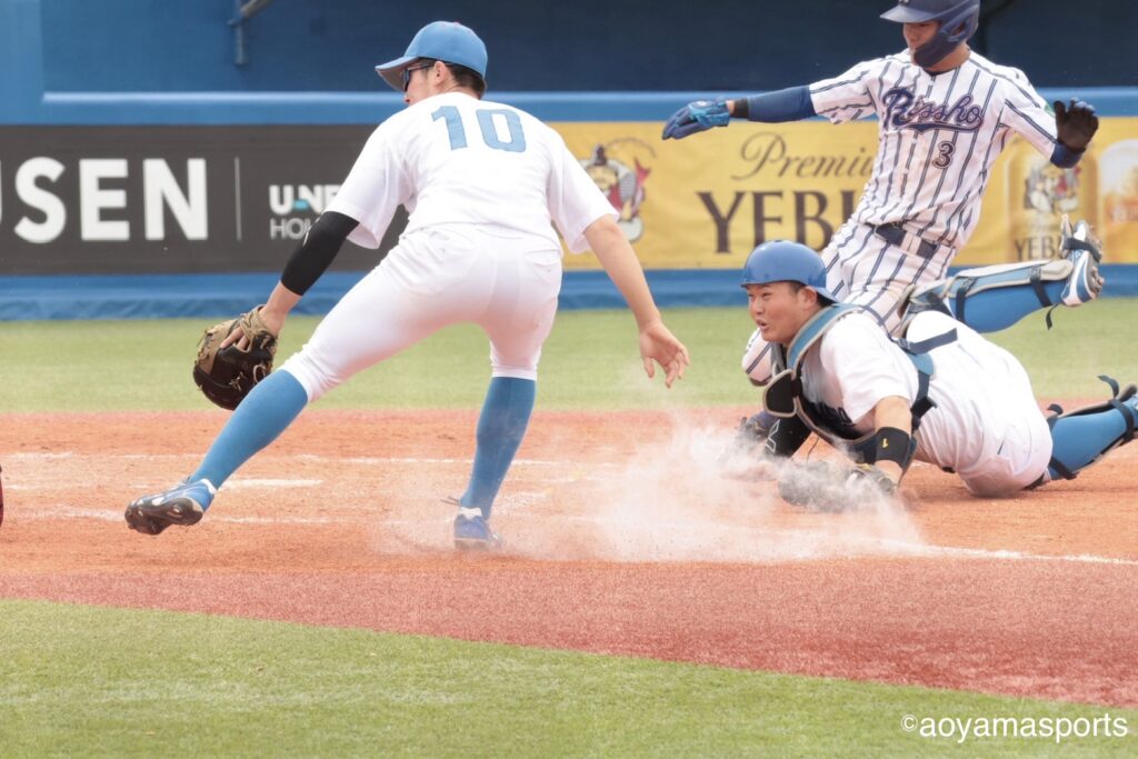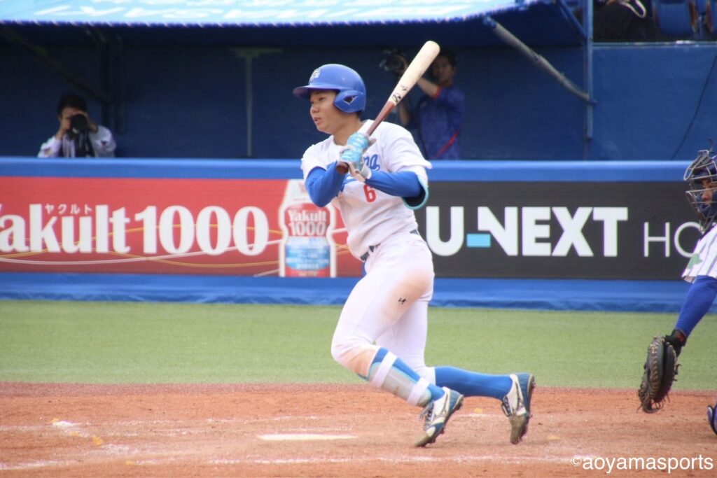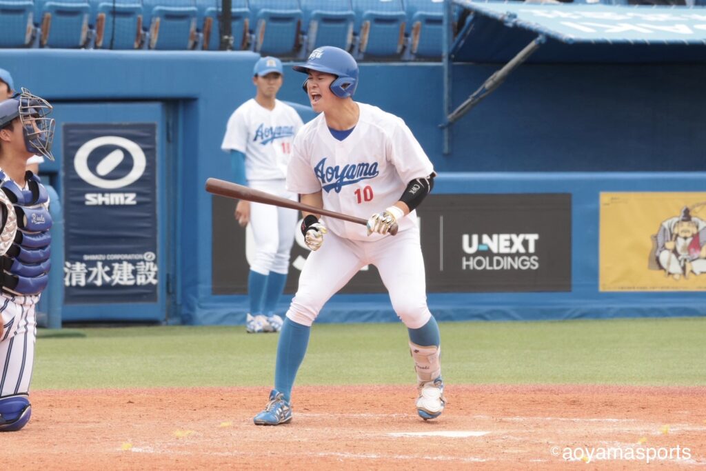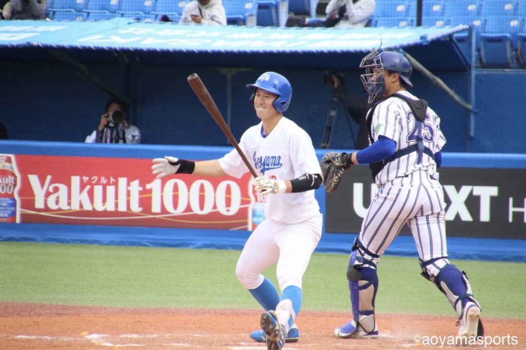 流れを変えたい青学大は直後の5回。相手の失策と四球で満塁のチャンスを作る。ここで打席に入った中山は、第1戦からここまでなかなか点が取れていなかった立正大先発・仁田から押し出し四球を選び同点に追いつく。さらに、この日7番に打順を上げた山口が三塁強襲の適時内野安打を放ち、2点を勝ち越した。