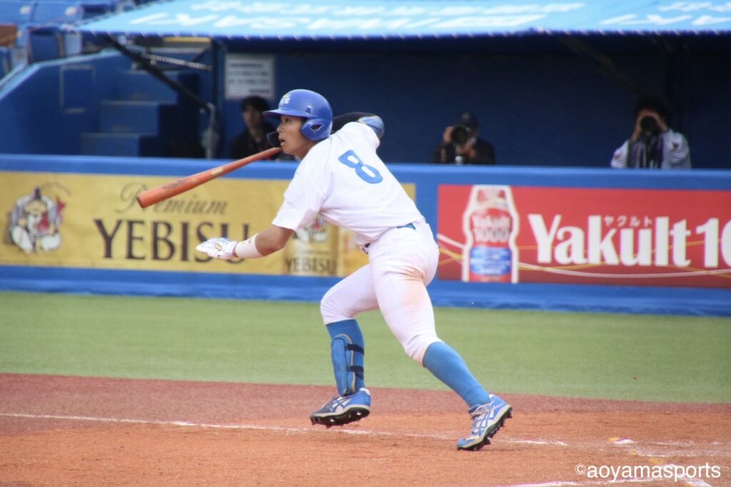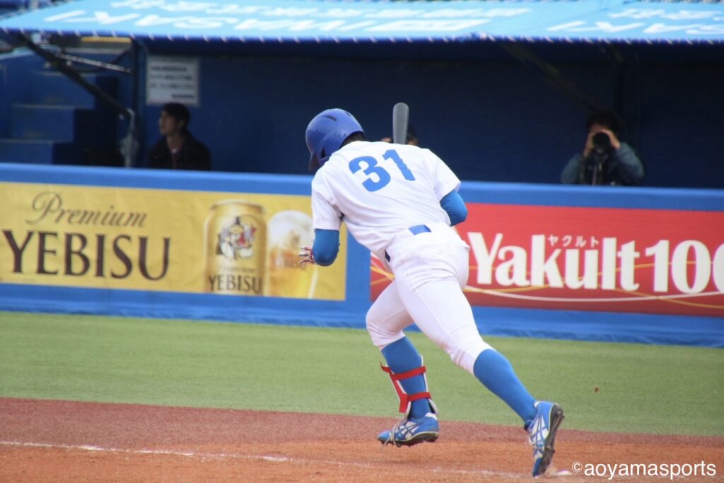 勝ち越しを狙う青学大打線は9回、一死から新井瑛太(社1=滝川)が左越え二塁打を放ちチャンスメイク。続く松本大和の右飛で、新井はタッチアップを狙うも、右翼手からの好返球に阻まれ進塁ならず。得点には至らない。
