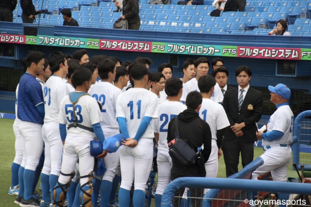 試合後、ミーティングを行う青学ナイン