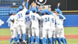 そんな初戦の先発を任されたのは常廣羽也斗(法4)。初回いきなり先頭の花田に二塁打を放たれるも、キャッチャー渡部海(コ1)が飛び出したランナーをアウトに仕留める好プレーもあり無失点で立ち上がる。その後も常廣はテンポよく投球を続け、スコアボードに0を並べる。